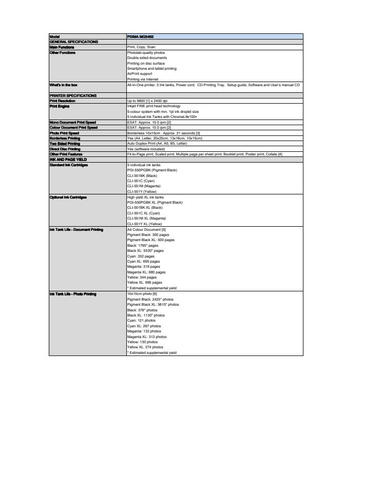 • Canon PIXMA MG5450 Tekniska specifikationer