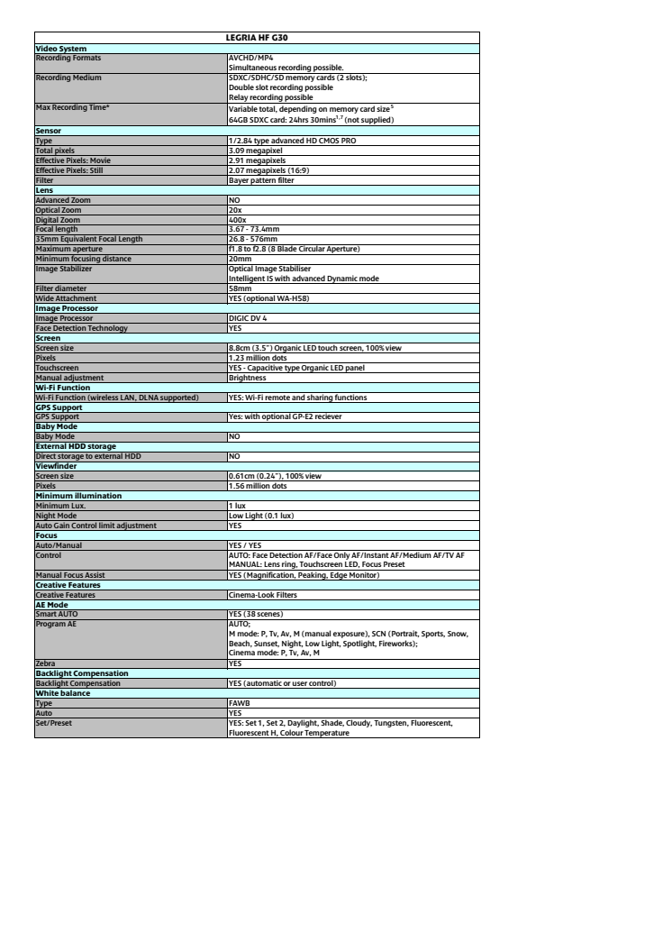 • Canon Tekniska specifikationer LEGRIA HF G30