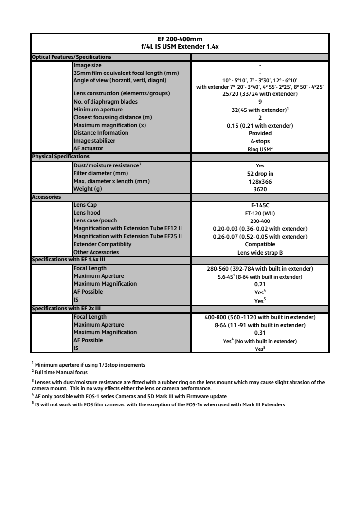 • Canon Tekniska specifikationer EF 200-400mm f/4L IS USM Extender 1.4x