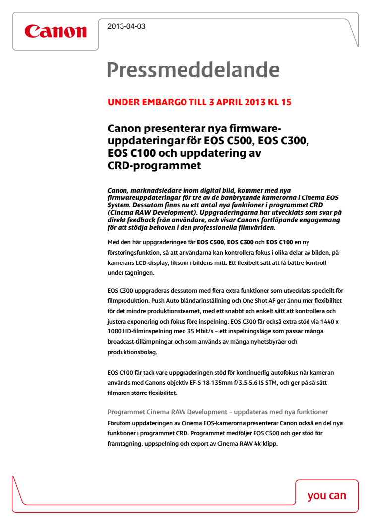 • Canon presenterar nya firmware-uppdateringar för EOS C500, EOS C300, EOS C100 och uppdatering av CRD programmet