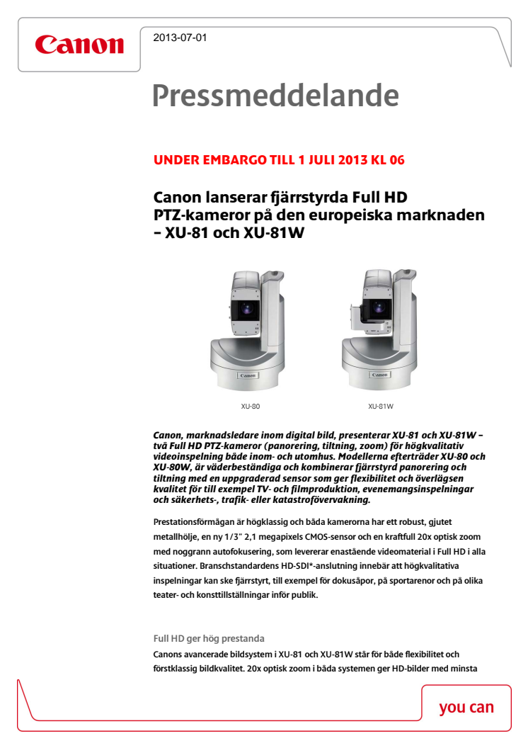 • Canon lanserar fjärrstyrda Full HD PTZ kameror på den europeiska marknaden – XU-81 och XU-81W