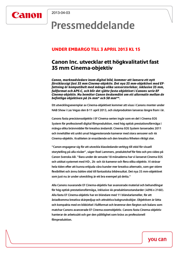 • Canon Inc. utvecklar ett högkvalitativt fast 35 mm Cinema-objektiv