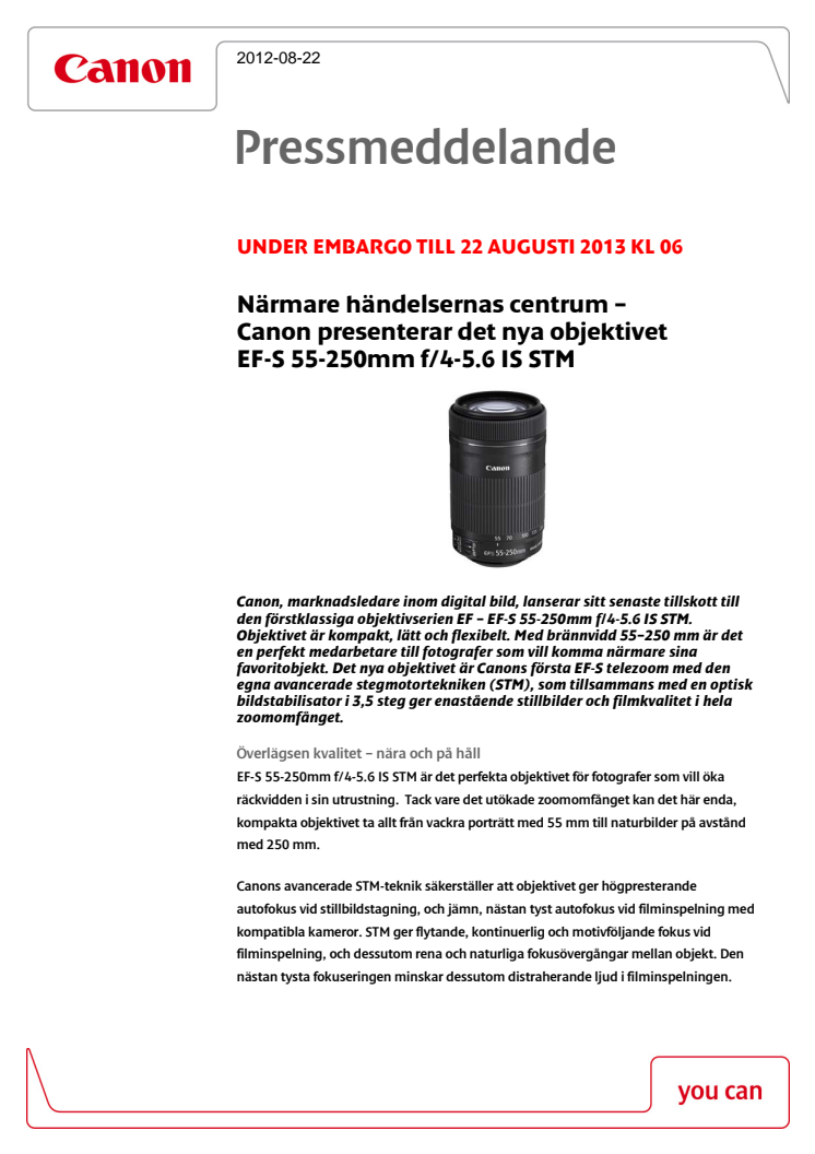 • Närmare händelsernas centrum – Canon presenterar det nya objektivet EF S 55 250mm f/4-5.6 IS STM