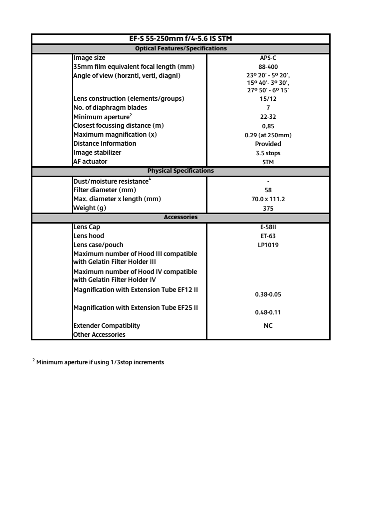 • Canon Tekniska specifikationer EF S 55 250mm f/4-5.6 IS STM