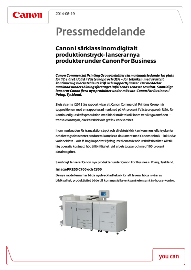 • Canon i särklass inom digitalt produktionstryck- lanserar nya produkter under Canon For Business