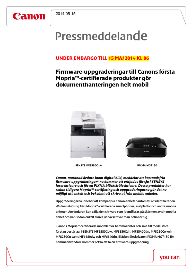 • Firmware-uppgraderingar till Canons första Mopria™-certifierade produkter gör dokumenthanteringen helt mobil