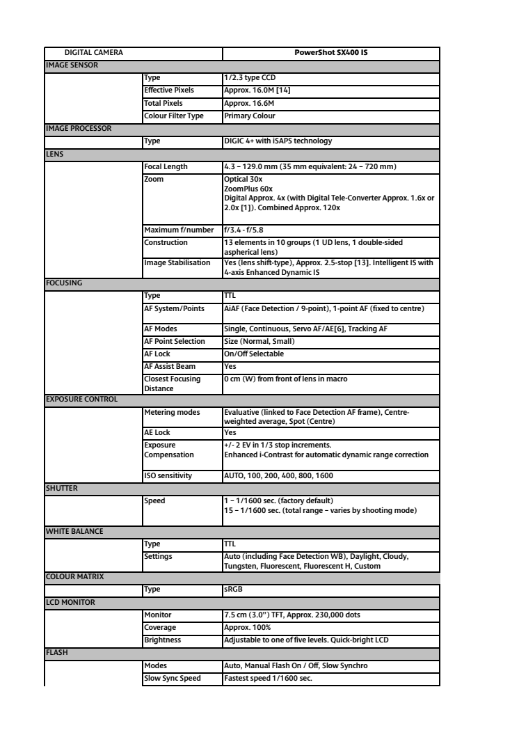 • Canon Tekniska specifikationer PowerShot SX400 IS