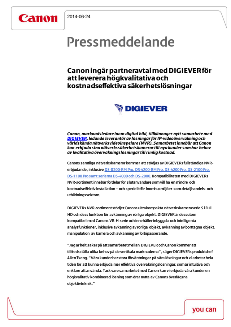 • Canon ingår partneravtal med DIGIEVER för att leverera högkvalitativa och kostnadseffektiva säkerhetslösningar