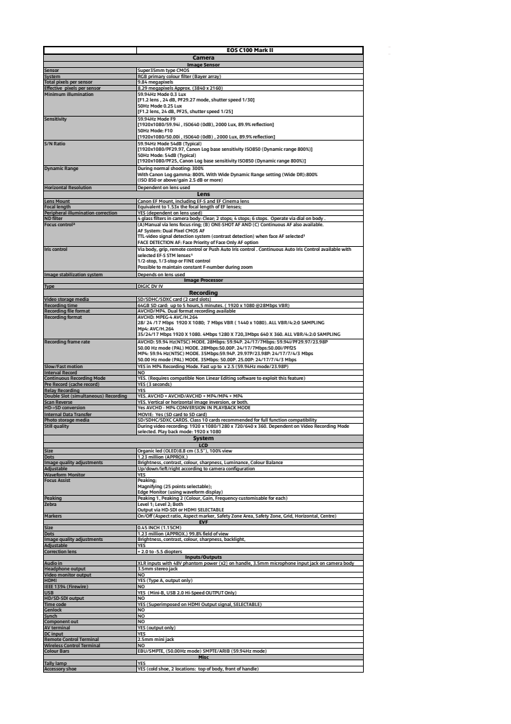 • Canon Tekniska specifikationer EOS C100 Mark II