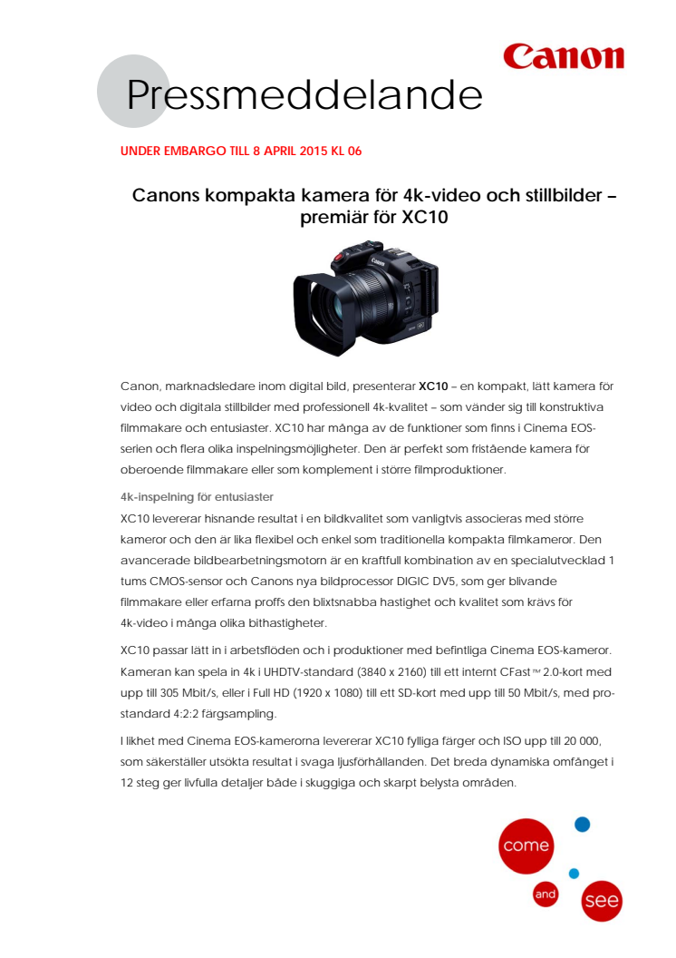 • Canons kompakta kamera för 4k-video och stillbilder – premiär för XC10