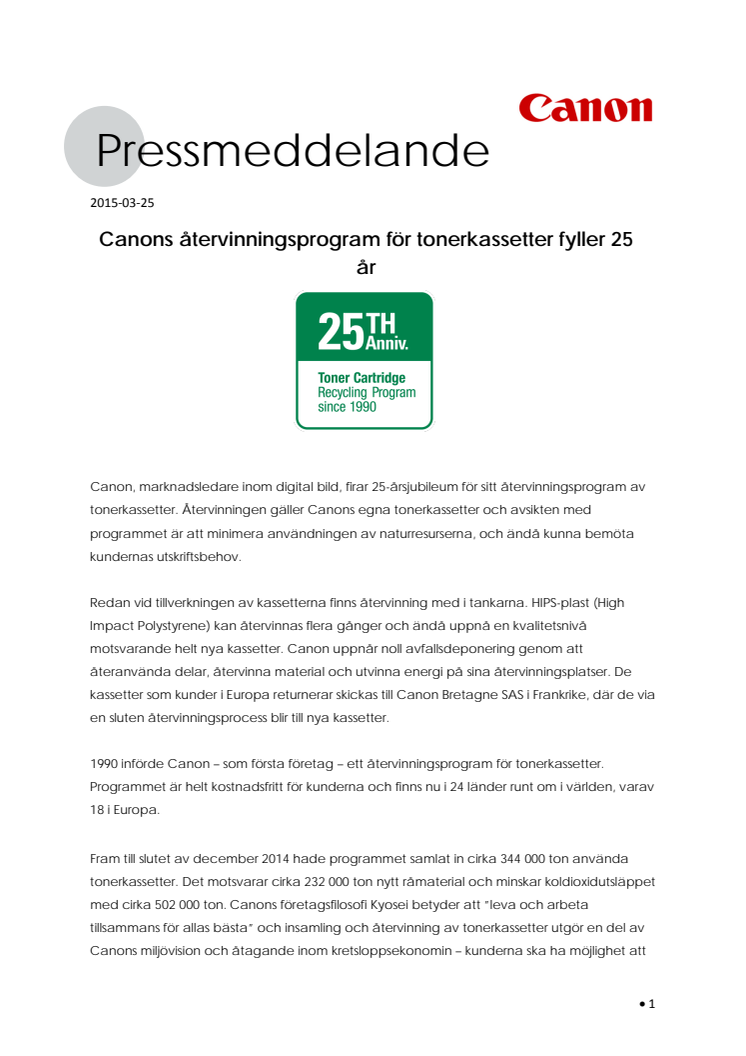 • Canons återvinningsprogram för tonerkassetter fyller 25 år