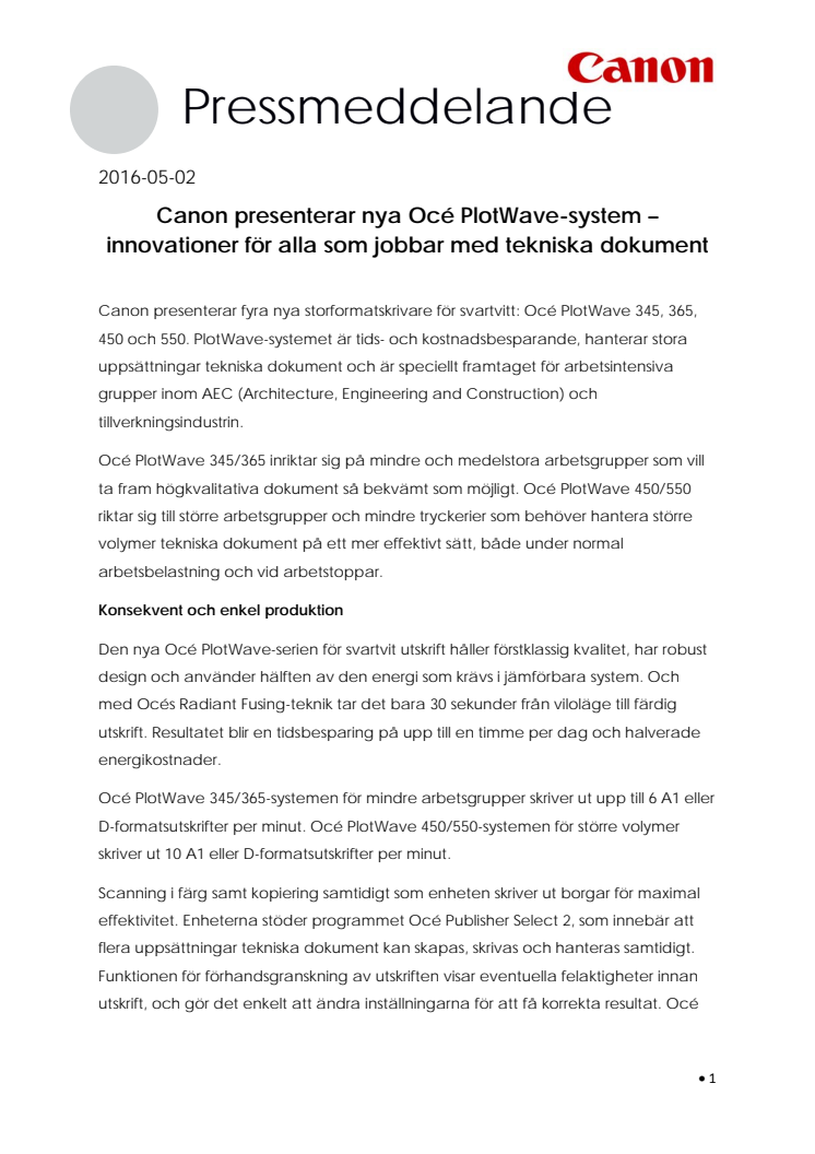 • Canon presenterar nya Océ PlotWave-system – innovationer för alla som jobbar med tekniska dokument