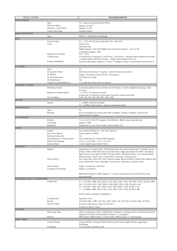 • Canon PowerShot SX620 HS Tekniska specifikationer