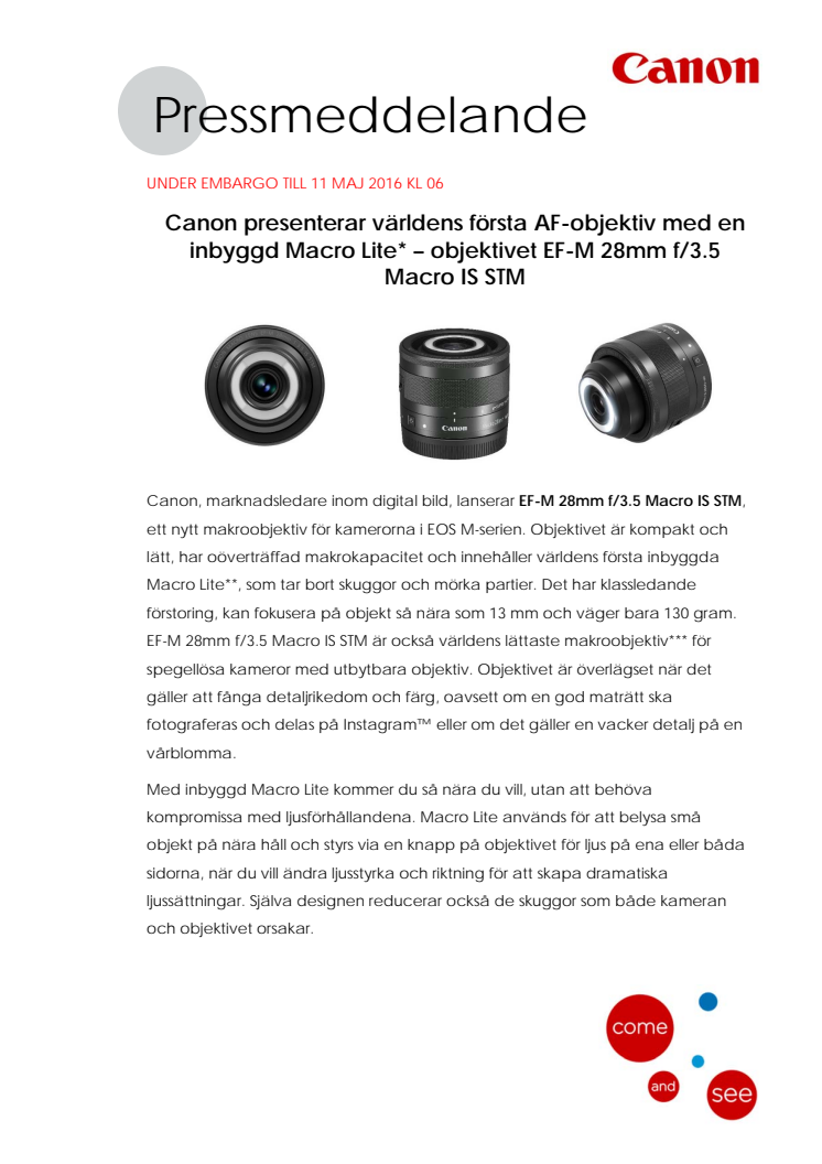 • Canon presenterar världens första AF-objektiv med en inbyggd Macro Lite* – EF-M 28mm f/3.5 Macro IS STM