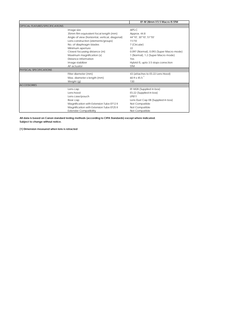 • Canon EF-M 28mm f/3.5 Macro IS STM Tekniska specifikationer