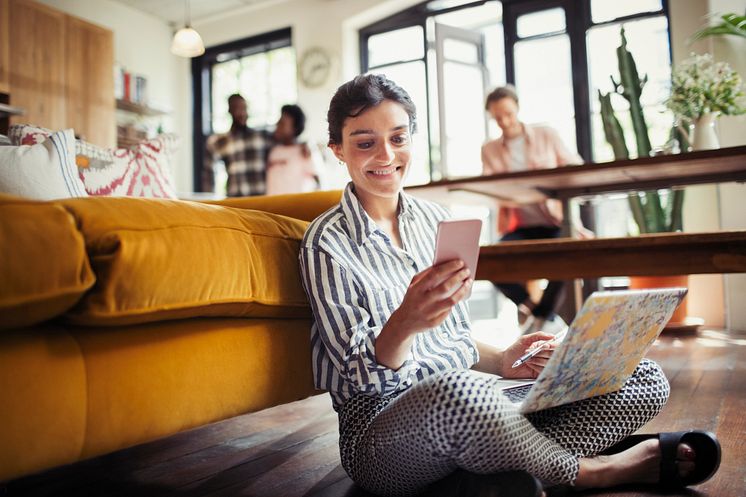 Smiling young woman using laptop and texting with smartphone_Paul Bradbury_GettyImages-922710980