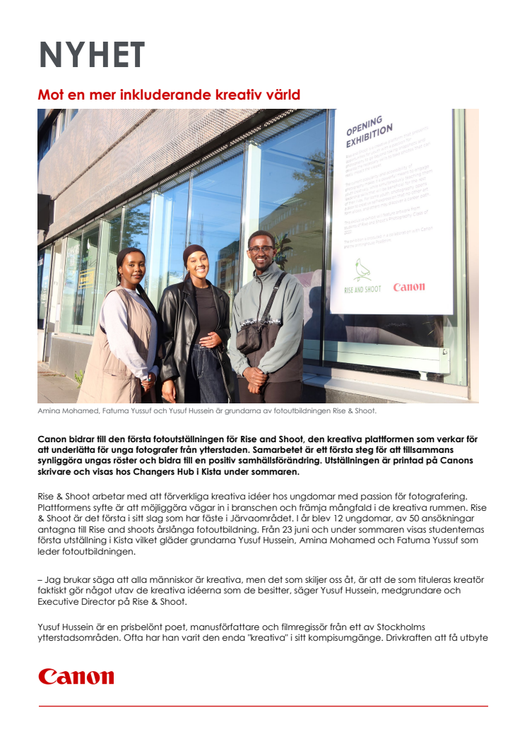 Canon bidrar till den första fotoutställningen för Rise and Shoot, den kreativa plattformen som verkar för att underlätta för unga fotografer från ytterstaden. Samarbetet är ett första steg för att tillsammans synliggöra ungas röster och bidra till en positiv samhällsförändring. Utställningen är printad på Canons skrivare och visas hos Changers Hub i Kista under sommaren.