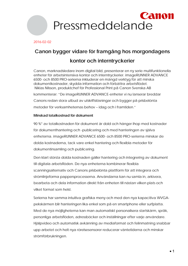 ”Canon strävar alltid efter att förstå kundernas problem och ta fram lösningar som hjälper dem nå sina mål. De nya enheterna bygger vidare för framgång och ger verksamheterna en pålitlig dokumentlösning som minskar kostnaderna, skyddar informationen och höjer produktiviteten under många år framöver”, säger Niklas Nilsson.