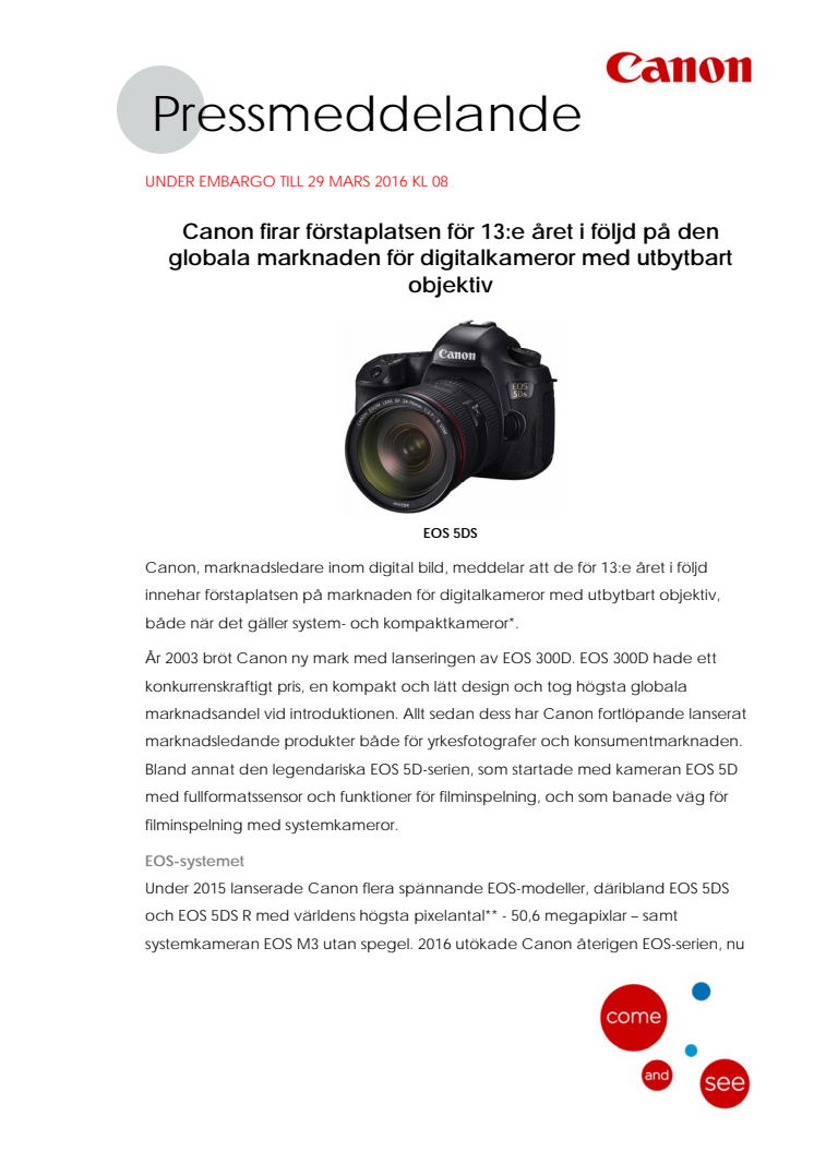 Canon, marknadsledare inom digital bild, meddelar att de för 13:e året i följd innehar förstaplatsen på marknaden för digitalkameror med utbytbart objektiv, både när det gäller system- och kompaktkameror*.