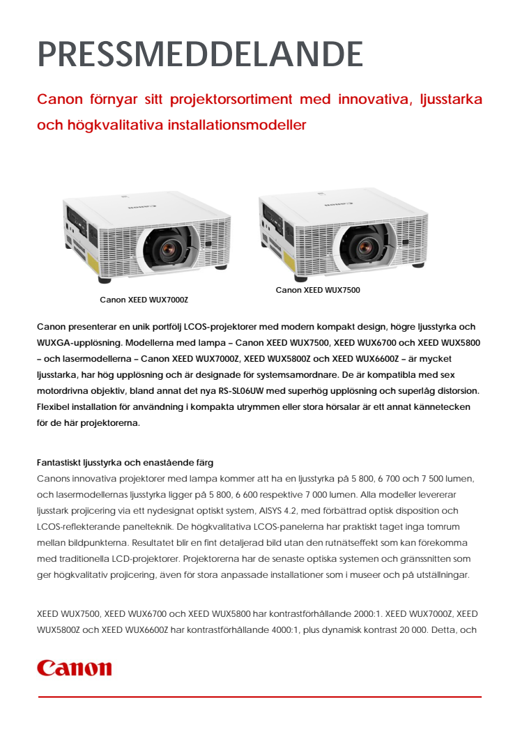 Canon presenterar en unik portfölj LCOS-projektorer med modern kompakt design, högre ljusstyrka och WUXGA-upplösning. Modellerna med lampa – Canon XEED WUX7500, XEED WUX6700 och XEED WUX5800 – och lasermodellerna – Canon XEED WUX7000Z, XEED WUX5800Z och XEED WUX6600Z – är mycket ljusstarka, har hög upplösning och är designade för systemsamordnare. De är kompatibla med sex motordrivna objektiv, bland annat det nya RS-SL06UW med superhög upplösning och superlåg distorsion. Flexibel installation för användning i kompakta utrymmen eller stora hörsalar är ett annat kännetecken för de här projektorerna.