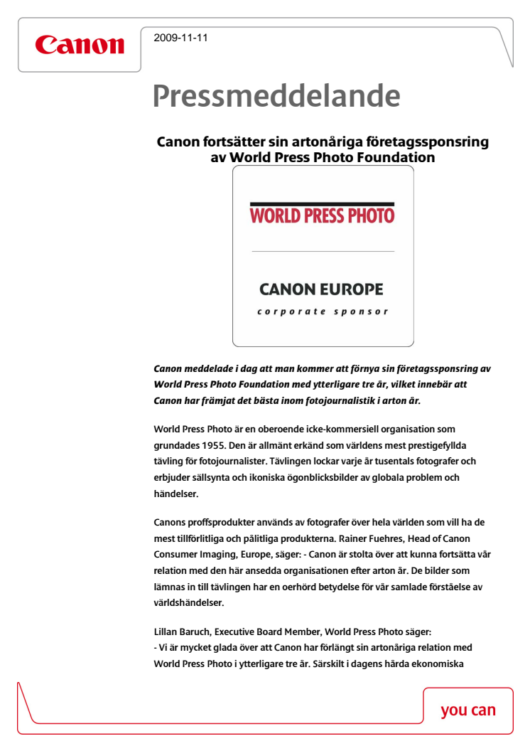- Vi är mycket glada över att Canon har förlängt sin artonåriga relation med World Press Photo i ytterligare tre år. Särskilt i dagens hårda ekonomiska klimat så betyder den här förnyade investeringen i fotobranschens framtid, och i vår organisation i synnerhet, mycket för oss. Vi ser fram emot att fördjupa vårt partnerskap och att tillsammans ta det till nästa nivå.