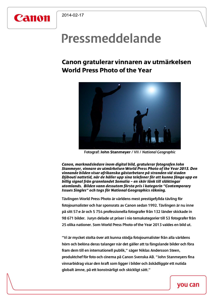 Canon, marknadsledare inom digital bild, gratulerar fotografen John Stanmeyer, vinnare av utmärkelsen World Press Photo of the Year 2013. Den vinnande bilden visar afrikanska gästarbetare på stranden vid staden Djibouti nattetid, när de håller upp sina telefoner för att kunna fånga upp en billig signal från grannlandet Somalia – en skör länk till släktingar utomlands. Bilden vann dessutom första pris i kategorin ”Contemporary Issues Singles” och togs för National Geographics räkning.