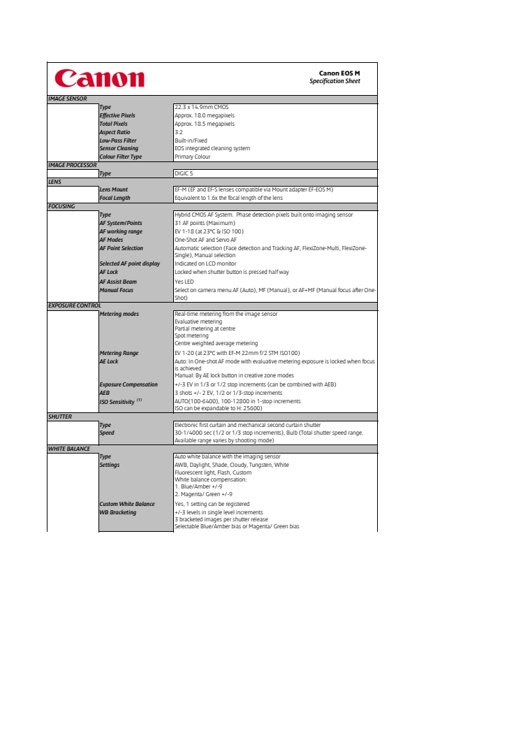 EOS M har en elegant, kompakt design och finns i färgerna svart, vitt, silver och rött. Samtidigt lanseras två nya objektiv – det kompakta, lätta objektivet EF-M 22mm f/2 STM och standardzoomen EF-M 18-55mm f/3.5-5.6 IS STM – liksom en ny, kompakt EX Speedlite-blixt – Speedlite 90EX. Den nya objektivadaptern EF-EOS M gör kameran kompatibel med Canons alla EF-objektiv, för ännu större flexibilitet och frihet.