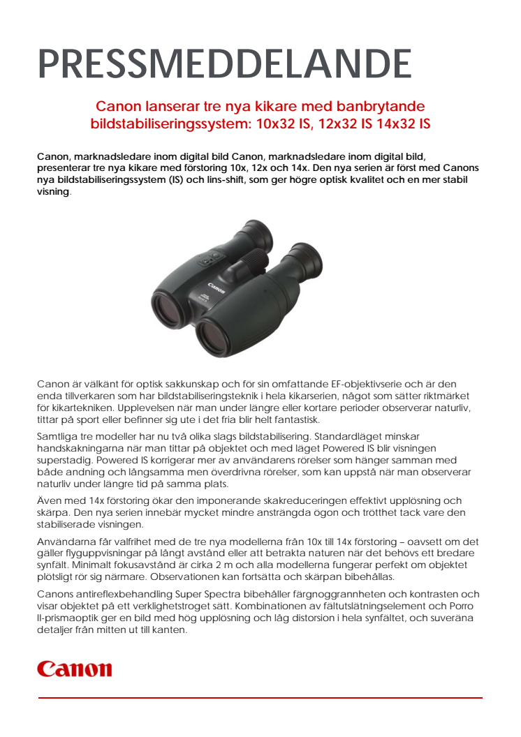 Canon, marknadsledare inom digital bild, presenterar tre nya kikare med förstoring 10x, 12x och 14x. Den nya serien är först med Canons nya bildstabiliseringssystem (IS) och lins-shift, som ger högre optisk kvalitet och en mer stabil visning.