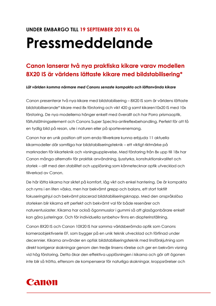 Canon presenterar två nya kikare med bildstabilisering – 8X20 IS som är världens lättaste bildstabiliserande* kikare med 8x förstoring och vikt 420 g samt kikaren10x20 IS med 10x förstoring. De nya modellerna hänger enkelt med överallt och har Porro prismaoptik, fältutslätningselement och Canons Super Spectra-antireflexbehandling. Perfekt för att få en tydlig bild på resan, ute i naturen eller på sportevenemang.