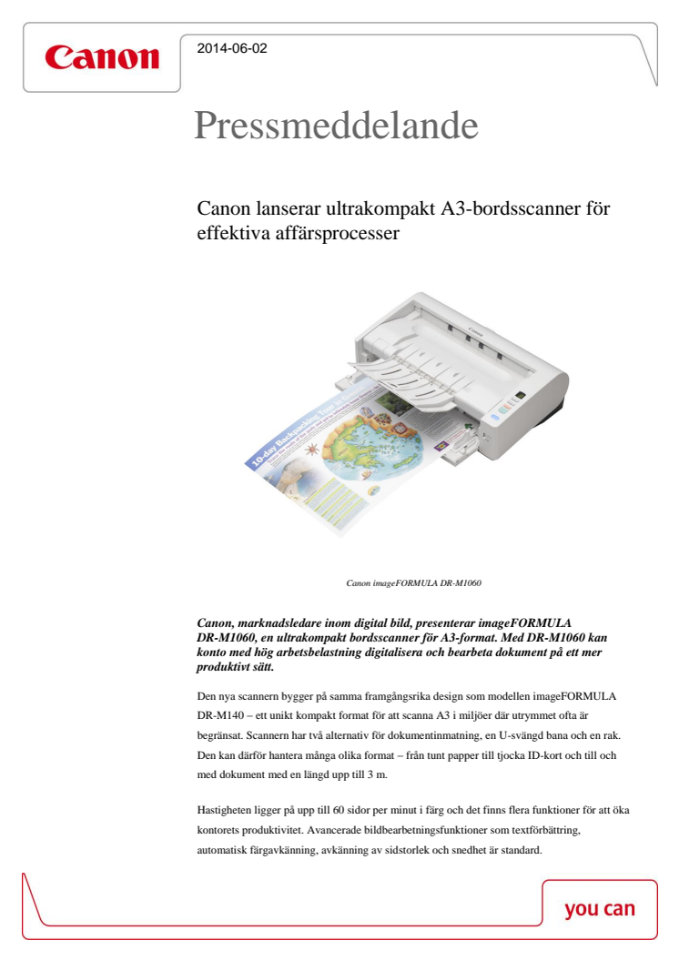 Canon, marknadsledare inom digital bild, presenterar imageFORMULA DR‑M1060, en ultrakompakt bordsscanner för A3‑format. Med DR-M1060 kan konto med hög arbetsbelastning digitalisera och bearbeta dokument på ett mer produktivt sätt.