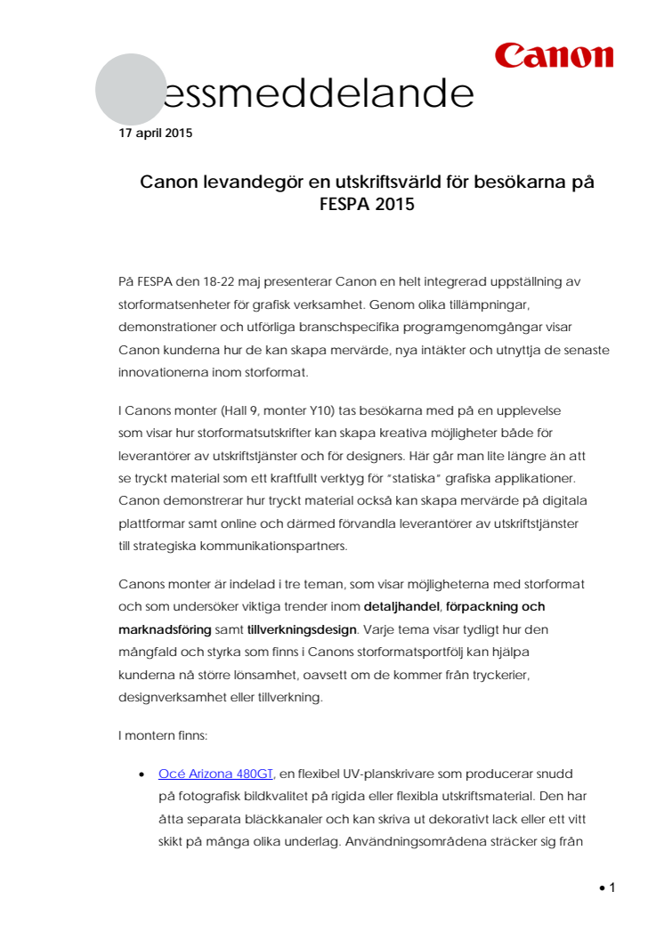 På FESPA den 18-22 maj presenterar Canon en helt integrerad uppställning av storformatsenheter för grafisk verksamhet. Genom olika tillämpningar, demonstrationer och utförliga branschspecifika programgenomgångar visar Canon kunderna hur de kan skapa mervärde, nya intäkter och utnyttja de senaste innovationerna inom storformat.