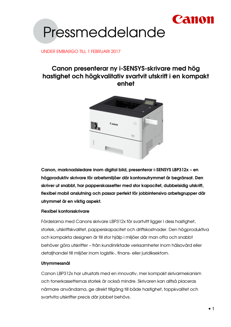 - Produkterna från Canon byggs upp genom samarbete med våra kunder, för att verkligen förstå deras behov. LBP312x togs fram för alla som jobbar i mindre arbetsgrupper eller har små kontorsutrymmen och som ställer höga krav på sina dokumentutskrifter. Avdelningar eller verksamheter inom juridik, finans och logistik måste kunna skriva ut stora mängder viktiga dokument i ett ofta begränsat kontorsutrymme. Den här skrivaren är perfekt för sådana behov. Mobil anslutning och nätverksintegrering gör den här enheten idealisk för rörliga arbetsgrupper, och kompatibilitet med uniFLOW innebär att den enkelt fungerar i en befintlig utskriftsinfrastruktur.