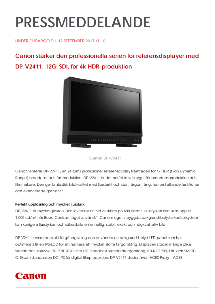 Canon lanserar DP-V2411, en 24-tums professionell referensdisplay framtagen för 4k HDR (High Dynamic Range) broadcast och filmproduktion.DP-V2411 är det perfekta verktyget för broadcastproduktion och filmmakare. Den ger fantastisk bildkvalitet med ljusstarkt och stort färgomfång, har omfattande funktioner och avancerade gränssnitt.