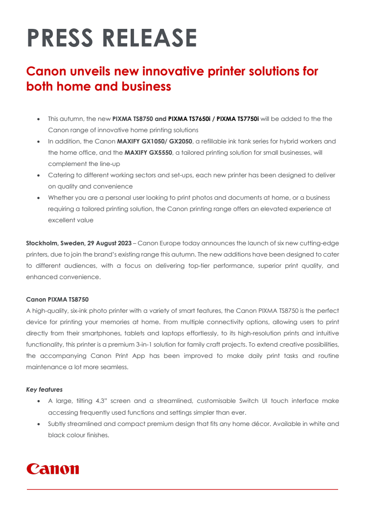Canon Europe today announces the launch of six new cutting-edge printers, due to join the brand’s existing range this autumn. The new additions have been designed to cater to different audiences, with a focus on delivering top-tier performance, superior print quality, and enhanced convenience.