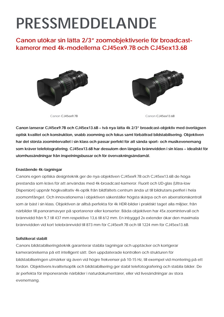 Canon lanserar CJ45ex9.7B och CJ45ex13.6B – två nya lätta 4k 2/3” broadcast-objektiv med överlägsen optisk kvalitet och konstruktion, snabb zoomning och fokus samt förbättrad bildstabilisering. Objektiven har det största zoomintervallet i sin klass och passar perfekt för att sända sport- och musikevenemang som kräver telefotografering. CJ45ex13.6B har dessutom den längsta brännvidden i sin klass – idealiskt för utomhussändningar från inspelningsbussar och för övervakningsändamål.