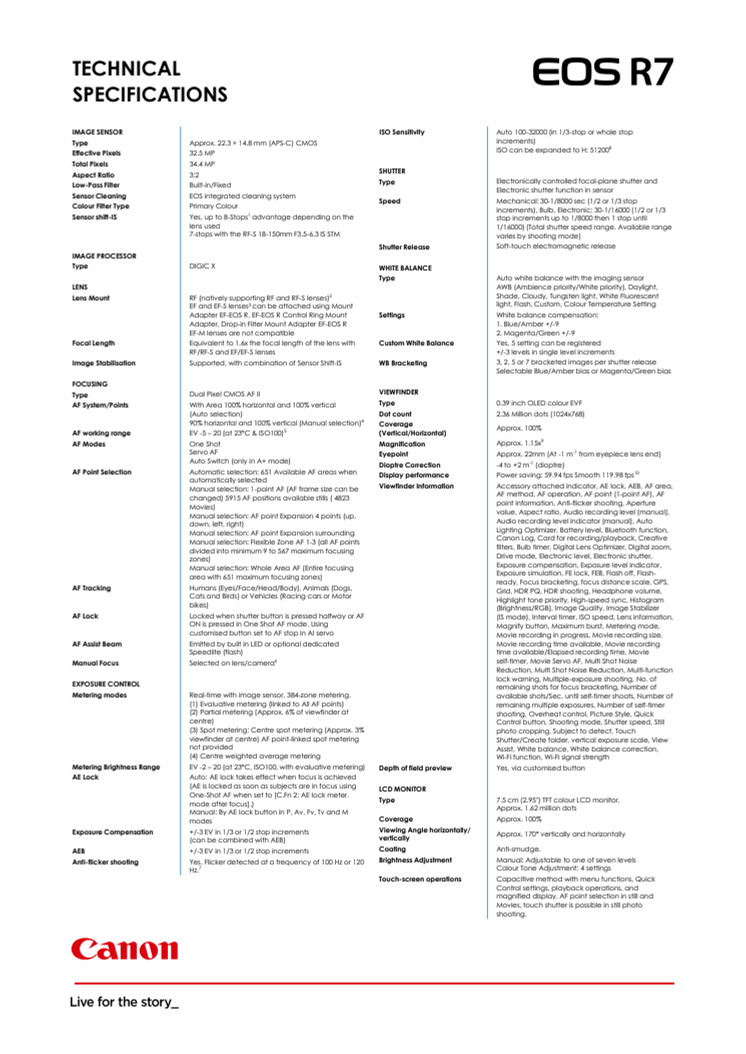 [vi] Bland samtliga digitala kameror med utbytbart objektiv (den 23 maj 2022), enligt Canons undersökning. Lutnings-/krängningsriktning, baserat på CIPA standarden, 8,0 steg med RF 24-105mm F4 L IS USM och brännvidd 105 mm. Bildstabiliseringsprestandan är samma som i EOS R5, EOS R6 och EOS R3. Beroende på inköpstillfälle kan objektivets firmware behöva uppdateras.