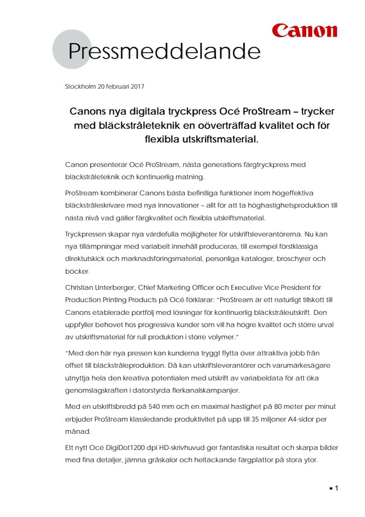 Christian Unterberger, Chief Marketing Officer och Executive Vice President för Production Printing Products på Océ förklarar: ”ProStream är ett naturligt tillskott till Canons etablerade portfölj med lösningar för kontinuerlig bläckstråleutskrift. Den uppfyller behovet hos progressiva kunder som vill ha högre kvalitet och större urval av utskriftsmaterial för rull produktion i större volymer.”