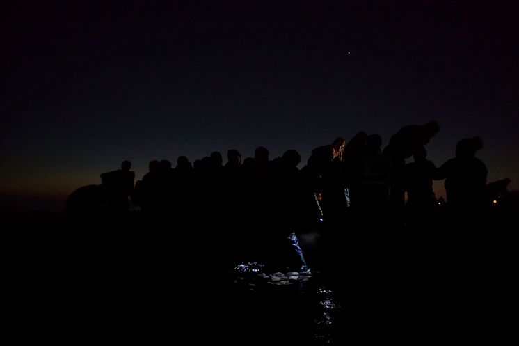 mörkret. I det här fallet har de valt en farligare kustremsa nära flygplatsen eftersom kustbevakningen patrullerar den norra delen dit flyktingar brukar ta sig. Man vet aldrig exakt var de kommer, det enda man kan se är ett blinkande ljus ute på havet från någon telefon. Jag fick en känsla att de rörde sig mot flygplatsens ljus och lyckades ta den här bilden vid stranden. Den får en 3D-effekt av att en hjälparbetares pannlampa fläckvis lyser upp i bilden.'