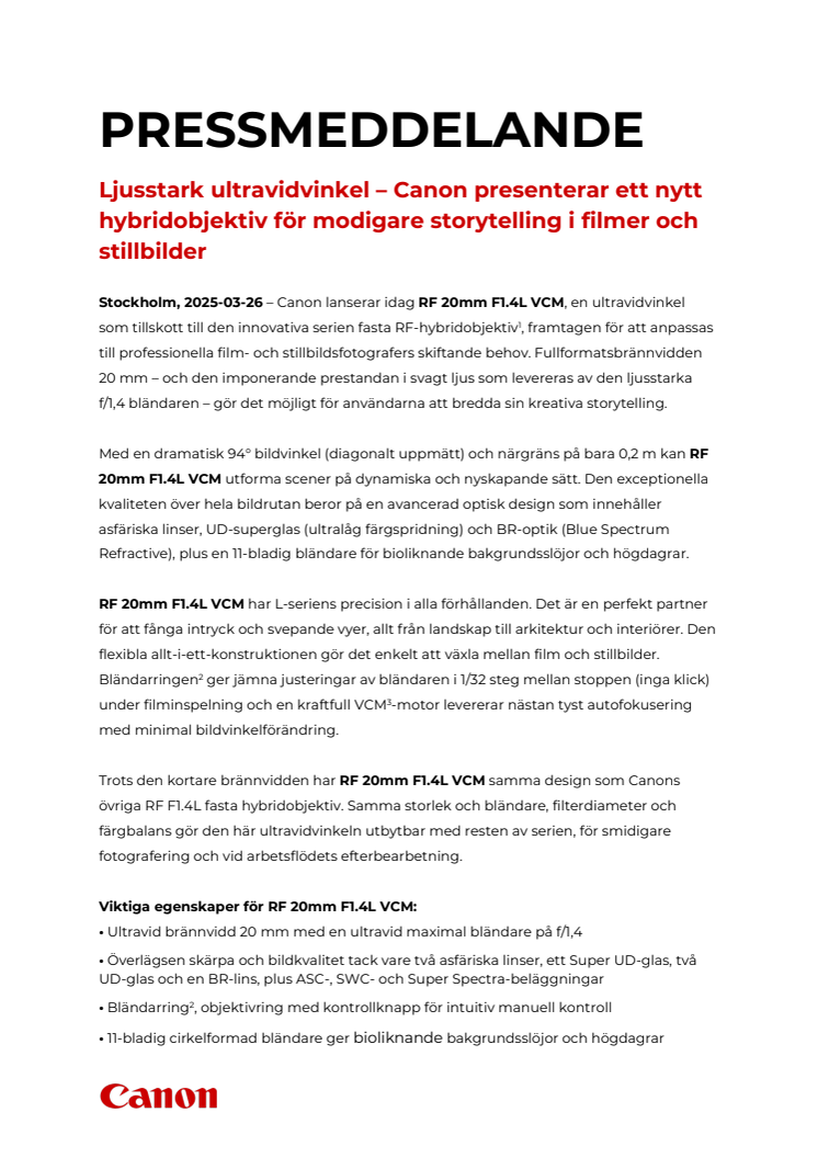 - Canon RF 20mm F1.4L VCM breddar den totala täckningen och mångsidigheten i serien där RF 24mm F1.4L VCM, RF 35mm F1.4L VCM och RF 50mm F1.4L VCM ingår – liksom RF 70-200mm F2.8L IS USM Z och RF 24-105mm F2.8L IS USM Z.