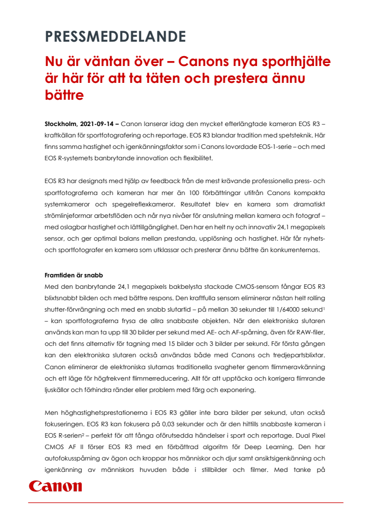 EOS R3 har designats med hjälp av feedback från de mest krävande professionella press- och sportfotograferna och kameran har mer än 100 förbättringar utifrån Canons kompakta systemkameror och spegelreflexkameror. Resultatet blev en kamera som dramatiskt strömlinjeformar arbetsflöden och når nya nivåer för anslutning mellan kamera och fotograf – med oslagbar hastighet och lättillgänglighet. Den har en helt ny och innovativ 24,1 megapixels sensor, och ger optimal balans mellan prestanda, upplösning och hastighet. Här får nyhets- och sportfotografer en kamera som utklassar och presterar ännu bättre än konkurrenternas.