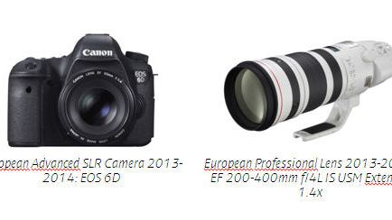 Canon, marknadsledare inom digital bild, meddelar att företaget har hedrats med tre prestigefyllda produktutmärkelser från EISA (European Imaging and Sound Association), Europas främsta sammanslutning inom ljud och bild. EOS 100D fick utmärkelsen European SLR Camera 2013-2014, objektivet EF 200-400mm f/4L IS USM Extender 1.4x omnämns som European Professional Lens 2013-2014 och Canon EOS 6D blev European Advanced SLR Camera 2013-2014 – något som återspeglar den enastående kvalitet som Canons produkter i hela serien av digitala systemkameror och objektiv representerar.
