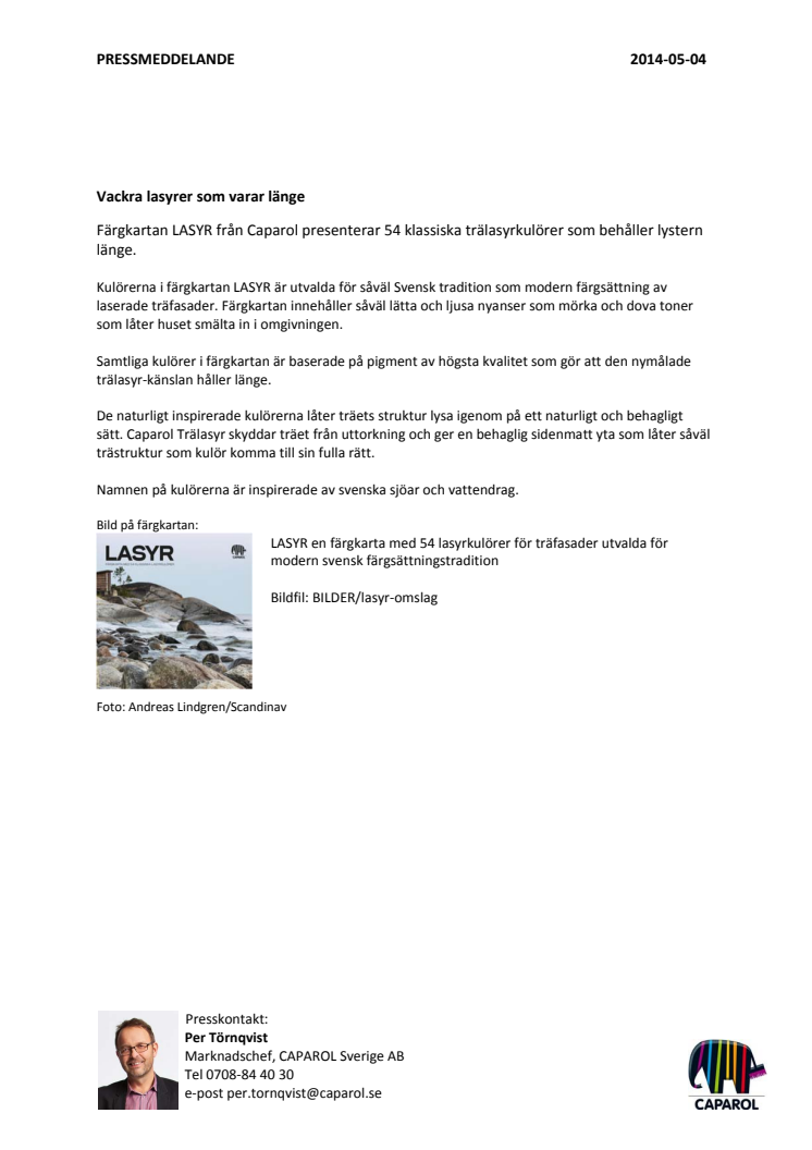 Färgkartan LASYR från Caparol presenterar 54 klassiska trälasyrkulörer som behåller lystern länge.