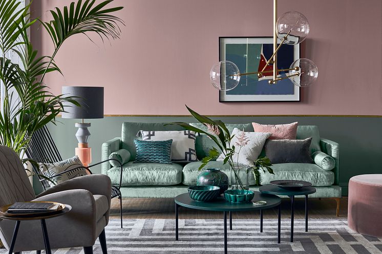 En miljöbild med kulörerna verdure och vanity från Caparol och Sköna Hems nya satsning Caparol by Sköna Hem.