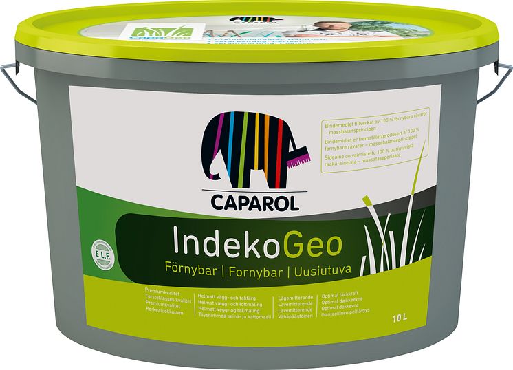 Om IndekoGeo: En helmatt inomhusfärg med alla de egenskaper du förväntar dig av en kvalitetsfärg. Ger en helt matt och vacker yta och är lämplig att använda på tak och väggar i alla torra rum inomhus. I väggfärgen används avfall från skogsindustrin för att skapa ett förnyelsebart bindemedel som helt kan ersätta det traditionella bindemedlet. Resultatet är en helmatt väggfärg med extremt hög täckkraft, som blir fin på vilken vägg som helst. IndekoGeo är dessutom en konserveringsmedelsfri färg som är skonsam för målaren och med avsevärt längre hållbarhet vid lagring. IndekoGeo finns i 1000-tals kulörer.