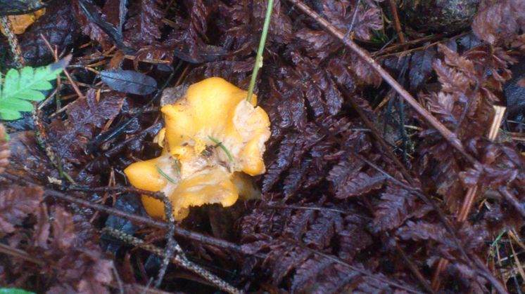 Då plötsligt, bakom en blå plasteka som var uppdragen för vintern, stod den där. En ensam stolt och klargul kantarell. Överraskande! En kaxig färgklick i en slumrande kompost.