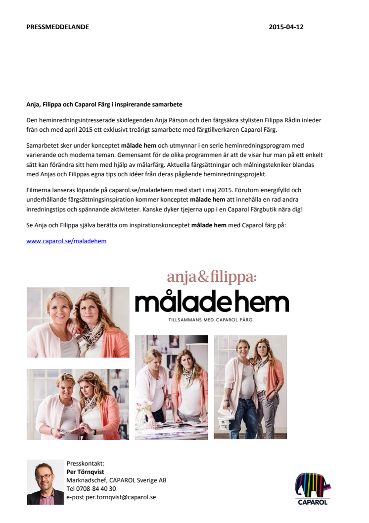 Den heminredningsintresserade skidlegenden Anja Pärson och den färgsäkra stylisten Filippa Rådin inleder från och med april 2015 ett exklusivt treårigt samarbete med färgtillverkaren Caparol Färg.