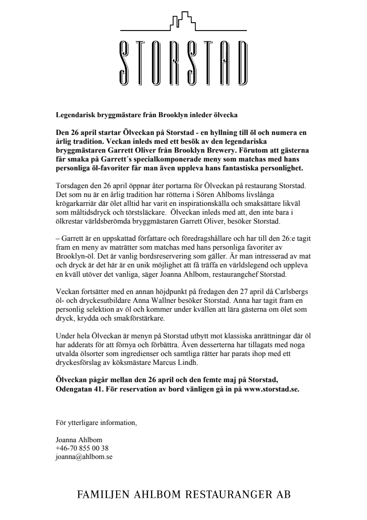 Den 26 april startar Ölveckan på Storstad - en hyllning till öl och numera en årlig tradition. Veckan inleds med ett besök av den legendariska bryggmästaren Garrett Oliver från Brooklyn Brewery.