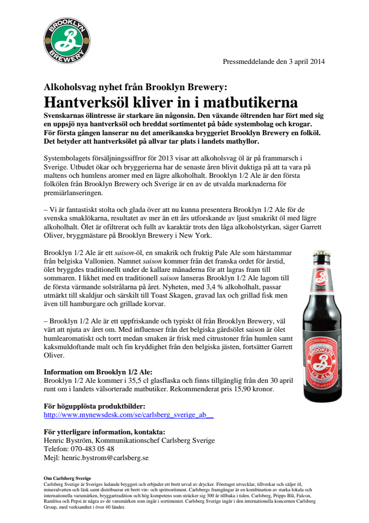 Systembolagets försäljningssiffror för 2013 visar att alkoholsvag öl är på frammarsch i Sverige. Utbudet ökar och bryggerierna har de senaste åren blivit duktiga på att ta vara på maltens och humlens aromer med en lägre alkoholhalt. Brooklyn 1/2 Ale är den första folkölen från Brooklyn Brewery och Sverige är en av de utvalda marknaderna för premiärlanseringen.
