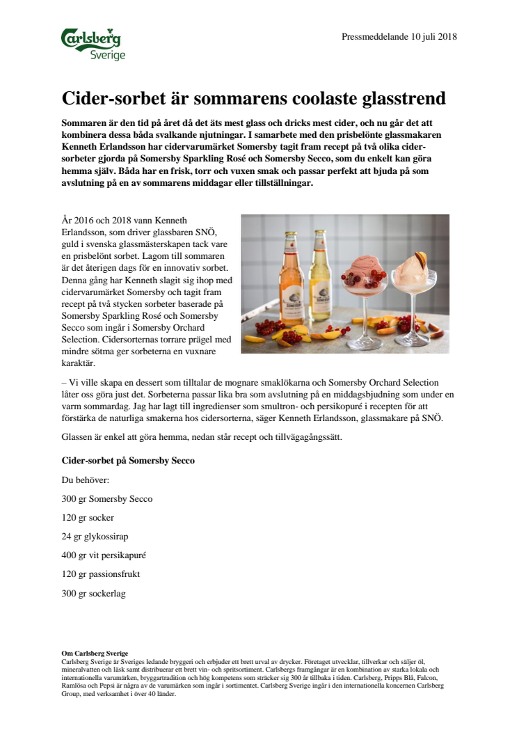 Sommaren är den tid på året då det äts mest glass och dricks mest cider, och nu går det att kombinera dessa båda svalkande njutningar. I samarbete med den prisbelönte glassmakaren Kenneth Erlandsson har cidervarumärket Somersby tagit fram recept på två olika cider-sorbeter gjorda på Somersby Sparkling Rosé och Somersby Secco, som du enkelt kan göra hemma själv. Båda har en frisk, torr och vuxen smak och passar perfekt att bjuda på som avslutning på en av sommarens middagar eller tillställningar.