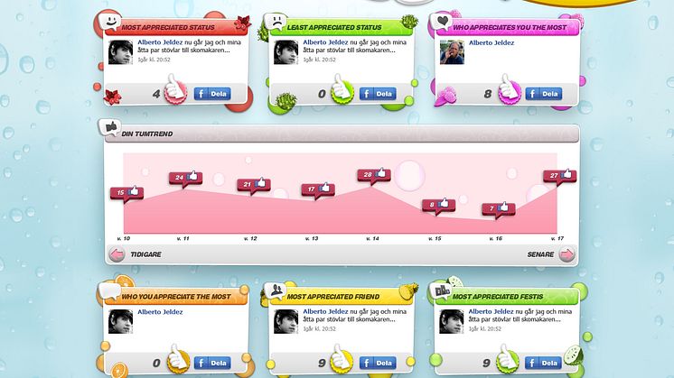 Facebooks utbredning i Sverige är rekordsnabb — de senaste 10 månaderna har antalet svenska medlemmar ökat med 1,2 miljoner. Och en stor del av ökningen sker i åldersgruppen 13-17 år. Genom Festis nya Facebook-applikation Festis Thumbstats kan du analysera hur bra Facebook-användare du egentligen är. Ju fler likes du får på dina statusuppdateringar — ju bättre, eller mer Festis, är du. Genom verktyget kan du enkelt följa din och dina vänners utveckling över tid och se vilka inlägg som uppskattas mest av vännerna på Facebook. Allt för att kunna slipa dina skills så att du blir ännu mer Festis. Festis Thumbstats finns att ladda ned på Festis kampanjsida www.festisthumbstats.se.